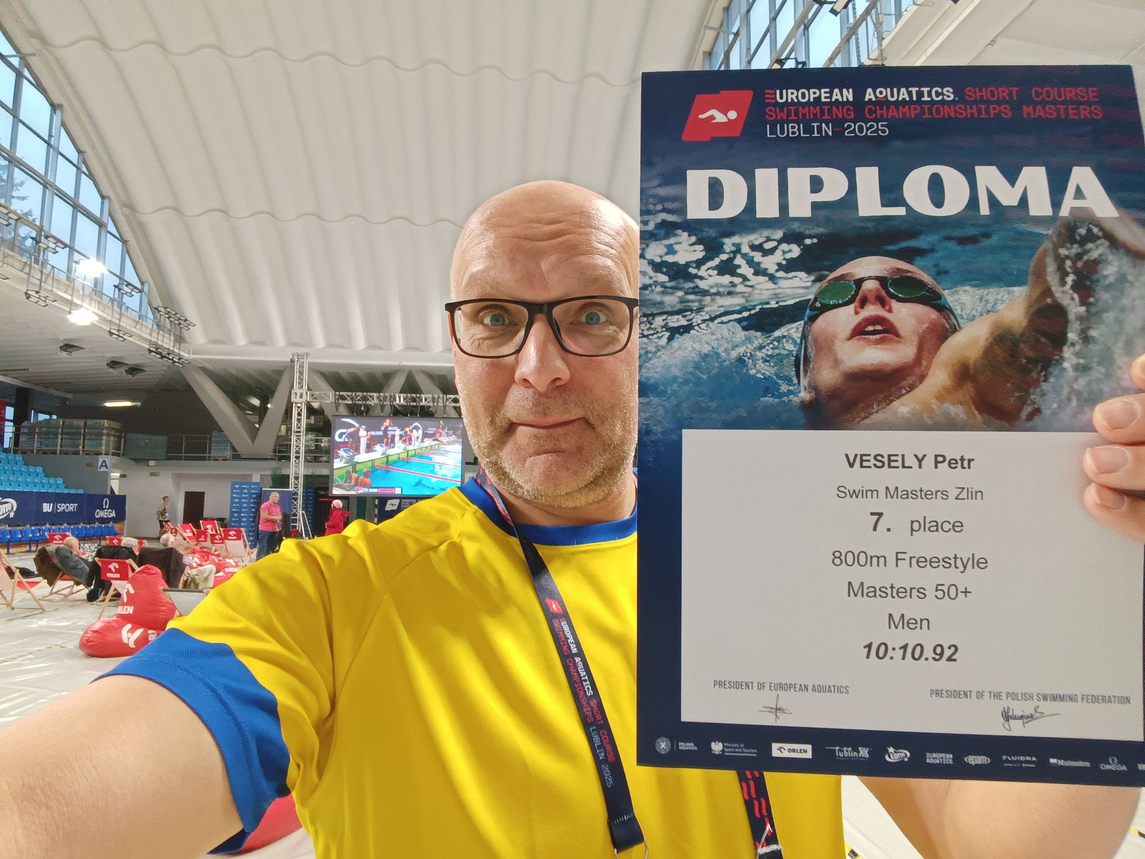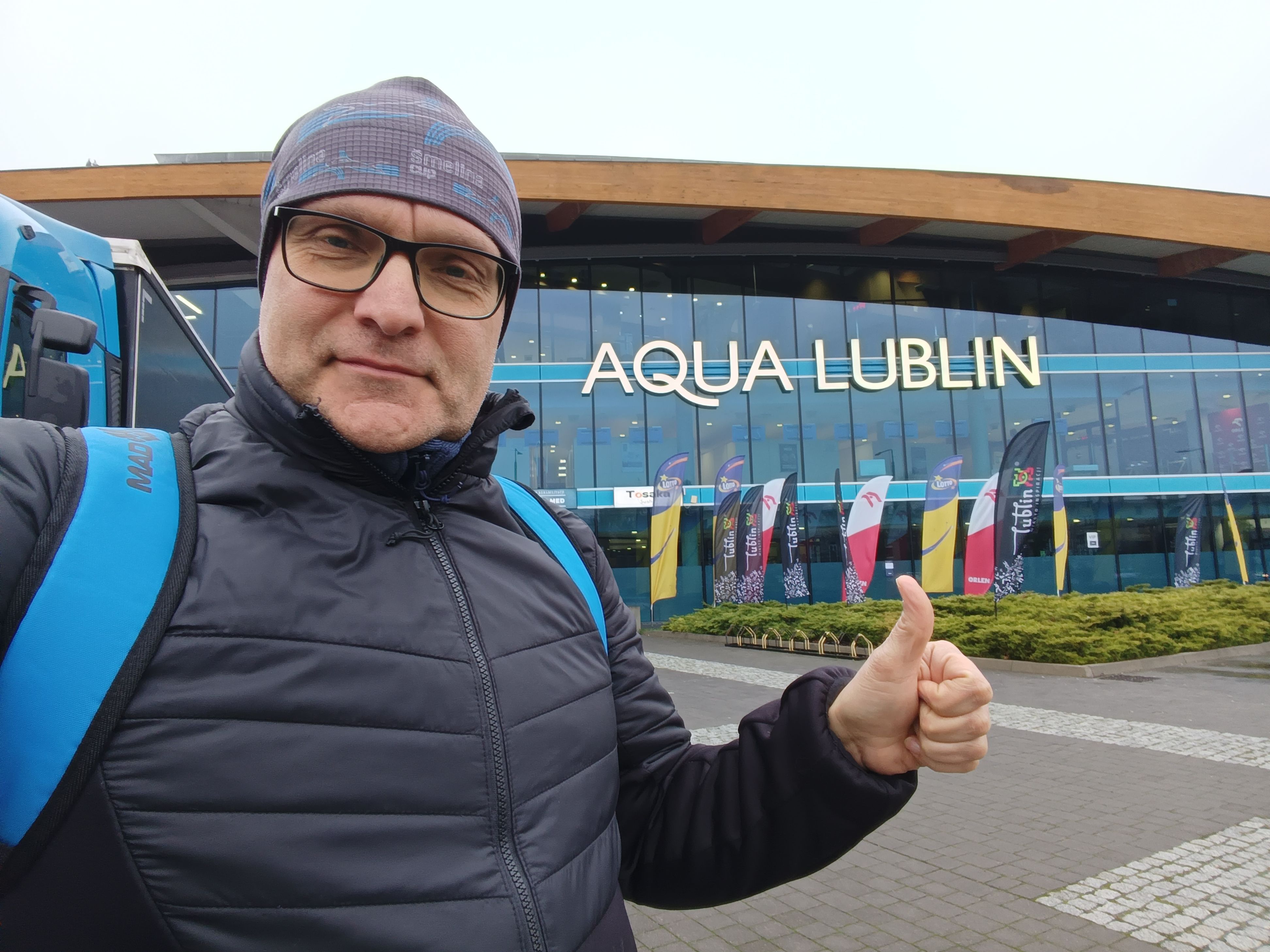 Co se týče moderní architektury, tak z takového autobusového nádraží vám spadne brada. Ale co mě i vás nejvíce zajímá je přece plavecký stadion Aqua Lublin. 10ti dráhová padesátka s mobilní obrátkovou stěnou rozdělující bazén na závodní 25m část a vyplavávací část, další 25m bazén na rozplavání, aquapark, tělocvična a navrch ještě lední kluziště. Tohle celé, bez toho kluziště, si dovolili v Lublinu zavřít pro veřejnost na dva týdny a uspořádat tu mistrovství Evropy elite a o týden později masters. Už se nedivím, že pro nás veterány to startovné bylo tak drahé. Kdo tu z krajanů byl asi neměl daleko k povzdechu: „Mít v Česku aspoň jeden takový bazén.”